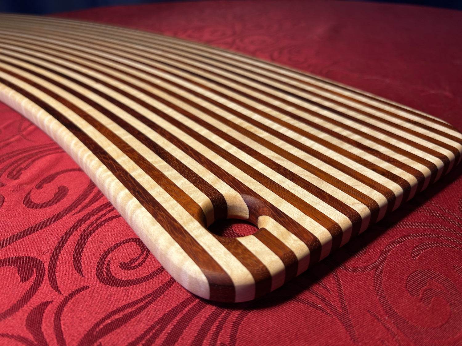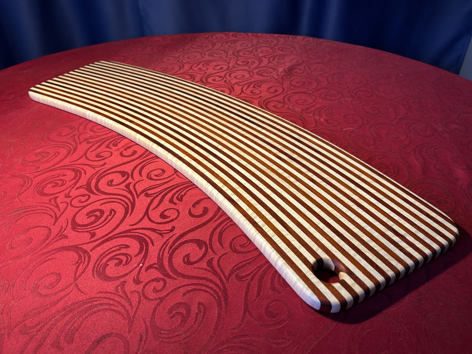 This elegant and simple board is made of thin strips carefully bent around a form and laminated together to give it a graceful curved appearance. It will add a delightful conversation piece to any dinner party and is ideal for laying out a medium sized charcuterie platter.