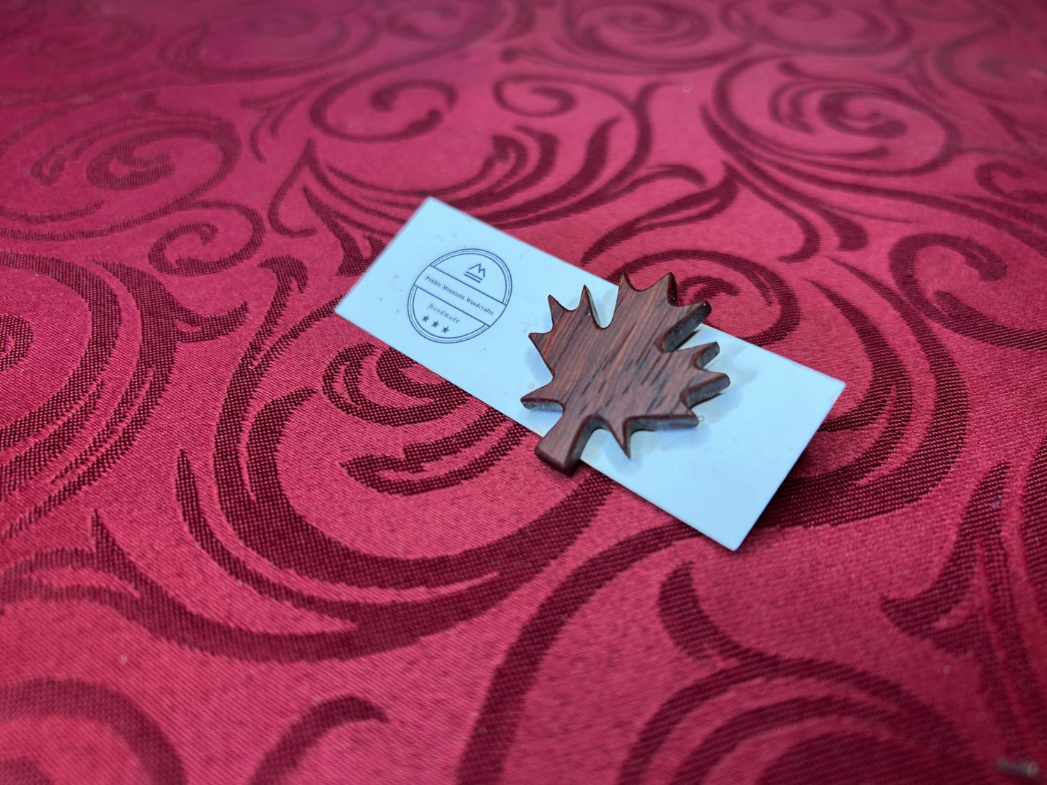 These delightful pins feature a handmade maple leaf design featuring the bold red of paduak wood. They have a standard pin attachment for fixing to clothing or bags.