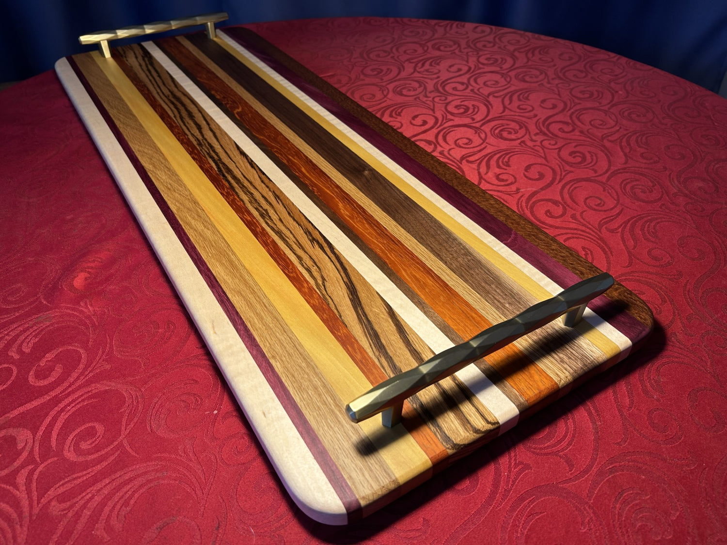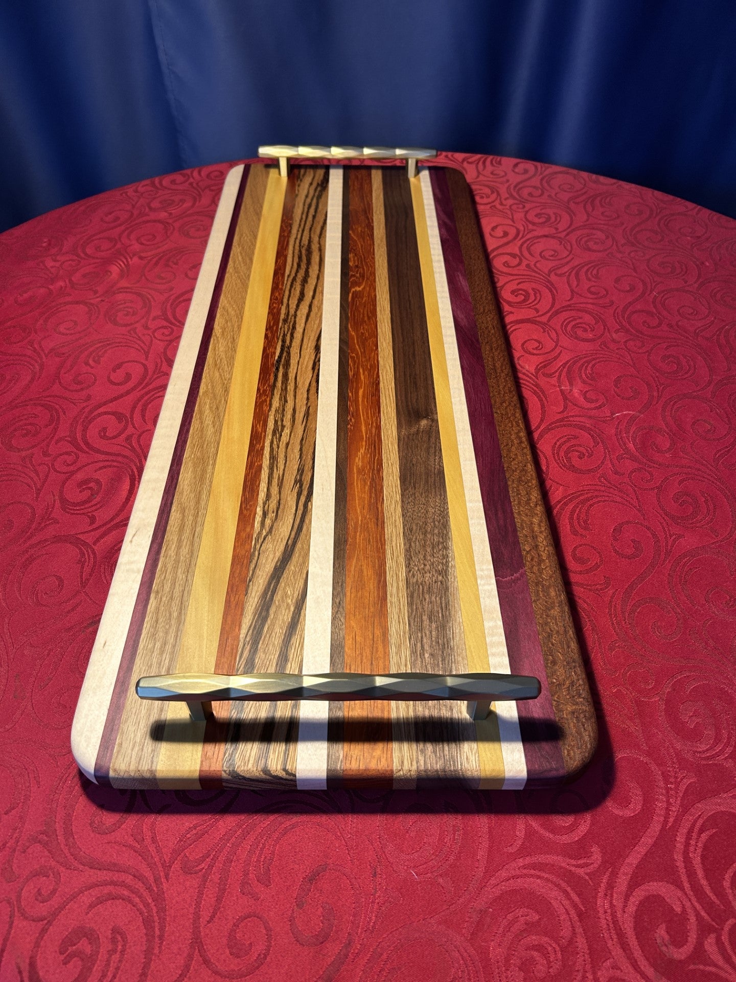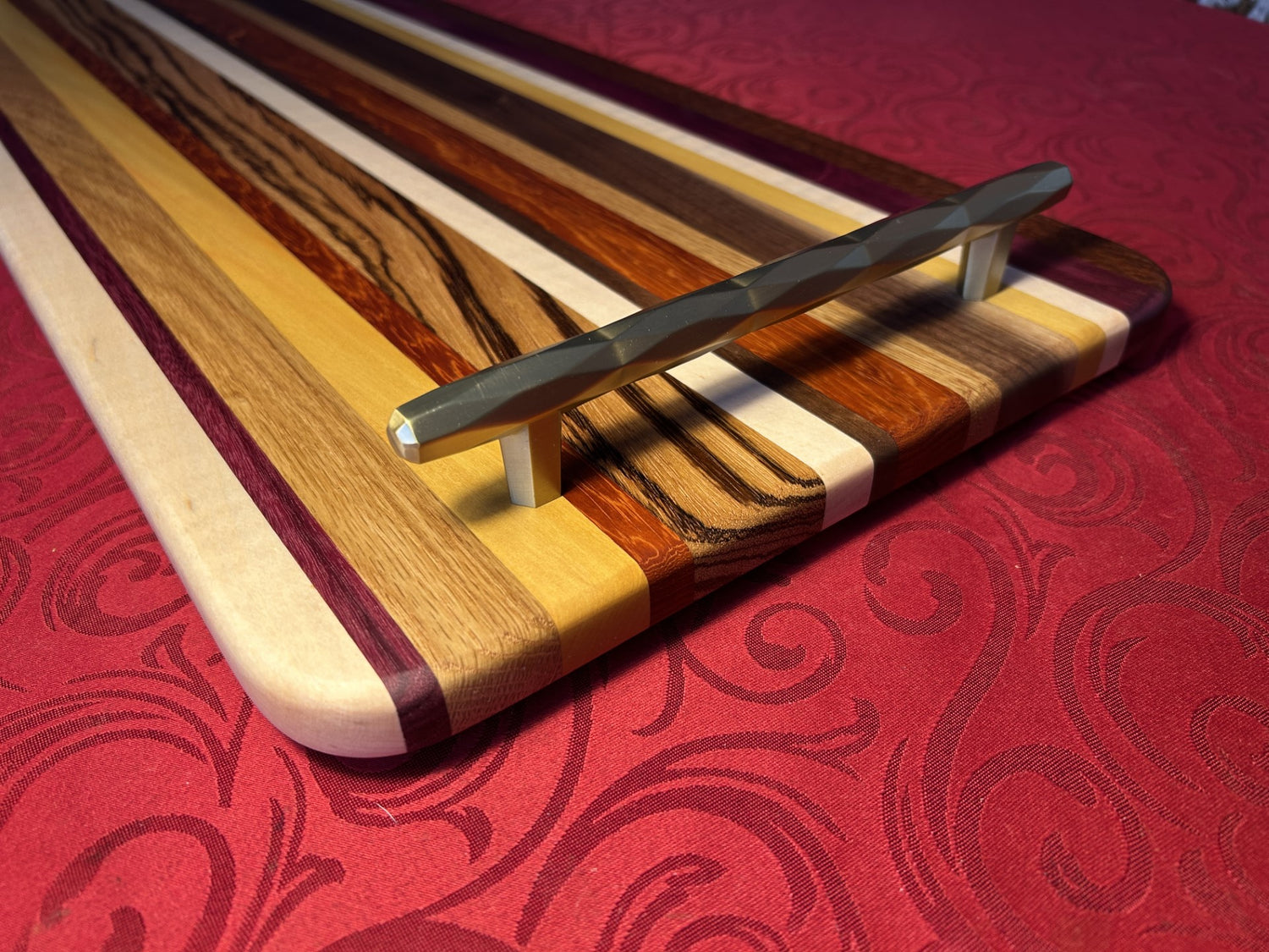 This large (32" long) and brightly coloured charcuterie board is the perfect accessory for either a dinner party or a family charcuterie feast. Much longer and thinner than a typical cutting board, this item is specifically designed as a serving platter, and has large solid rose gold coloured handles for ease of pick up. It is made from a large variety of richly coloured and contrasting hardwoods.