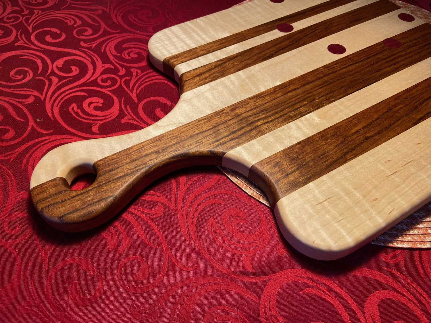 This item utilizes curly maple and jatoba, along with purpleheart and padauk accents, to provide a robust cutting board. It is finished with a food safe oil and wax combination. It also has a large 7/8" hole in the handle for hanging.