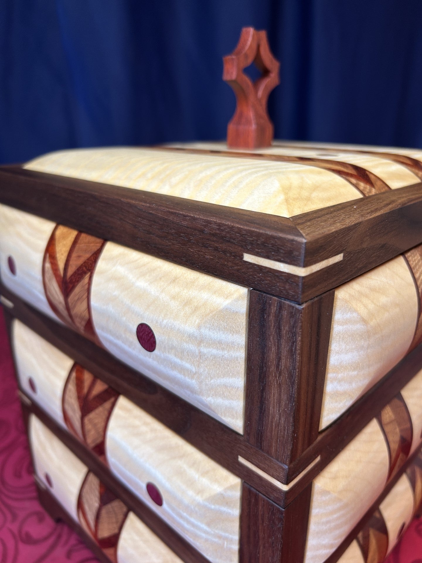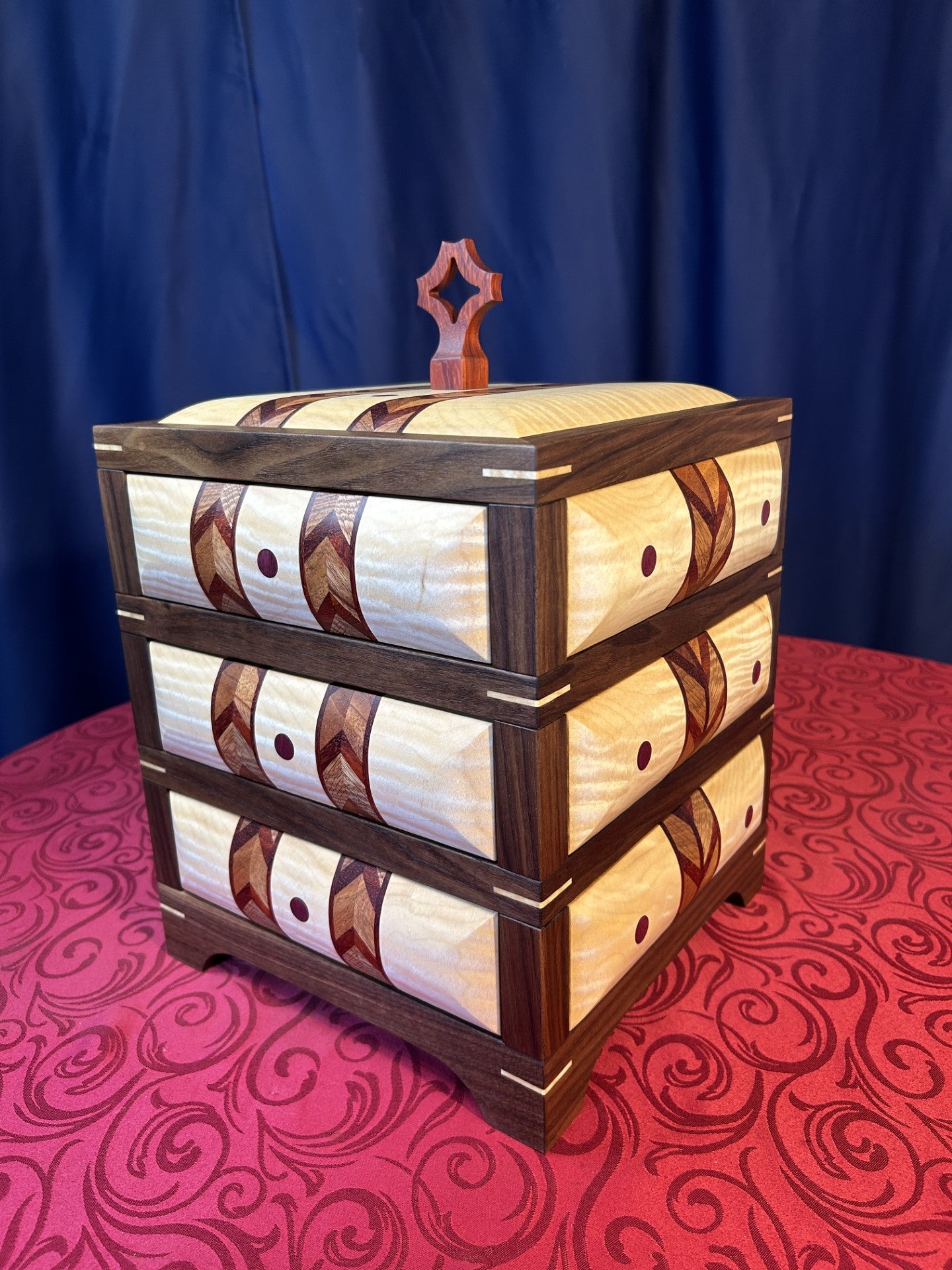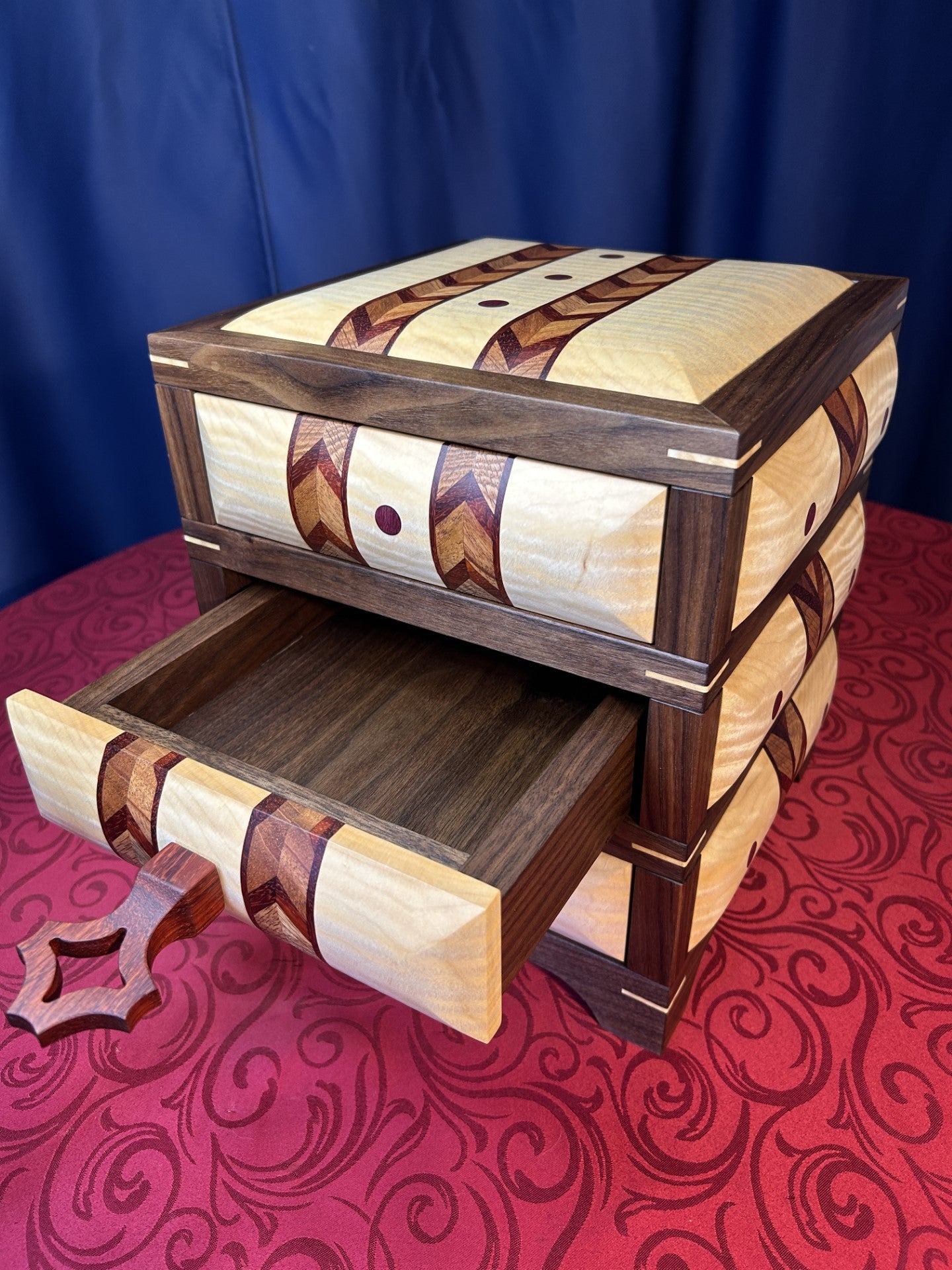 This large eye catching jewellery chest features bulging ornamented curly maple panels nestled into a dark walnut frame. The three drawers are inset into the frame to match the panels, and can be opened using a decorative magnetic pull which stores on the top panel when not in use. The drawers feature a removable maple spline and walnut runners to ensure smooth and level operation, can be removed by tipping upwards when fully open, and are securely held in place with smaller magnets. The curly maple shimmer and carefully crafted design using various woods make this an unforgettable piece of art as well as a functional chest, and it is finished with non-toxic oil varnish and beeswax.