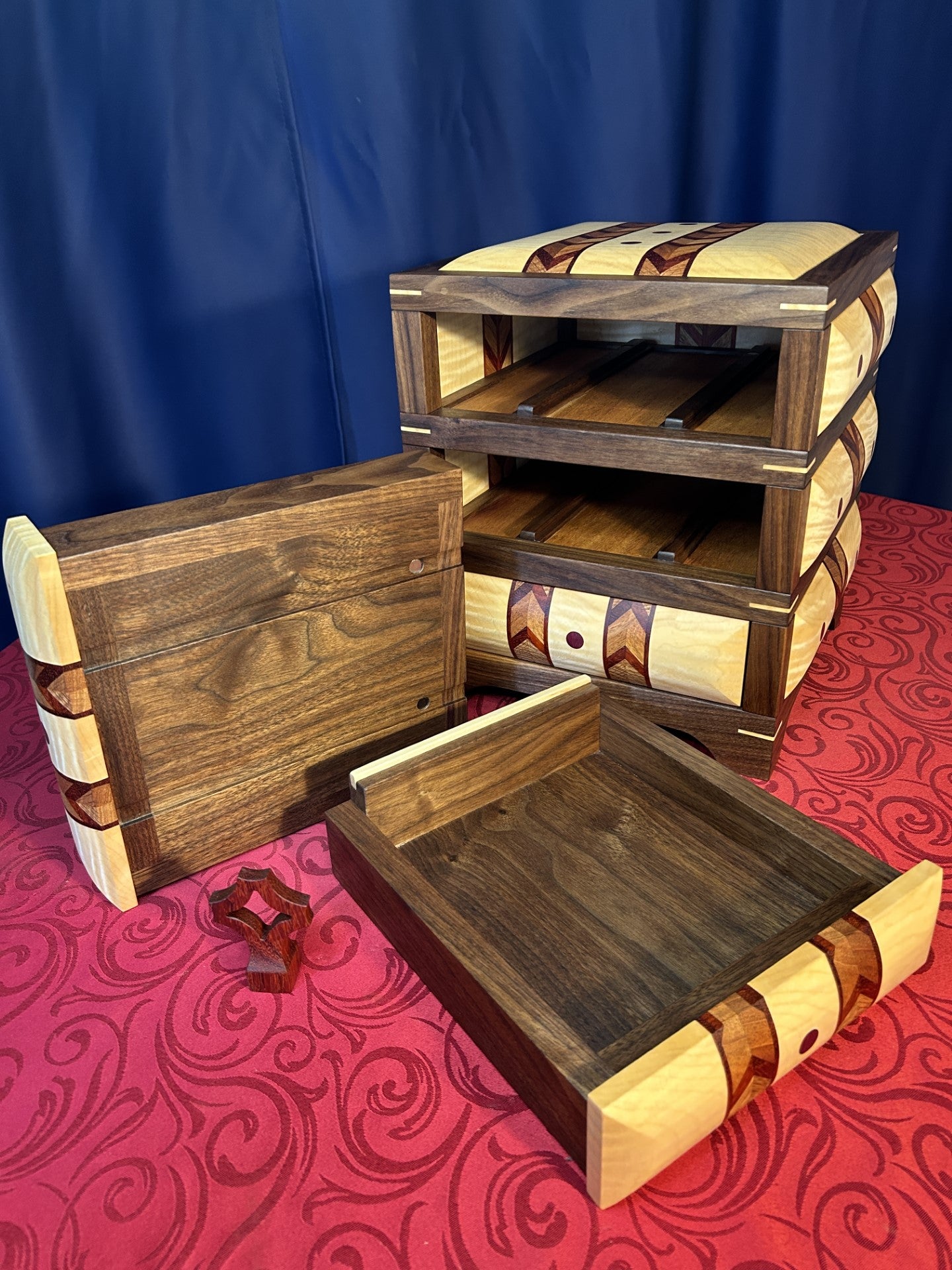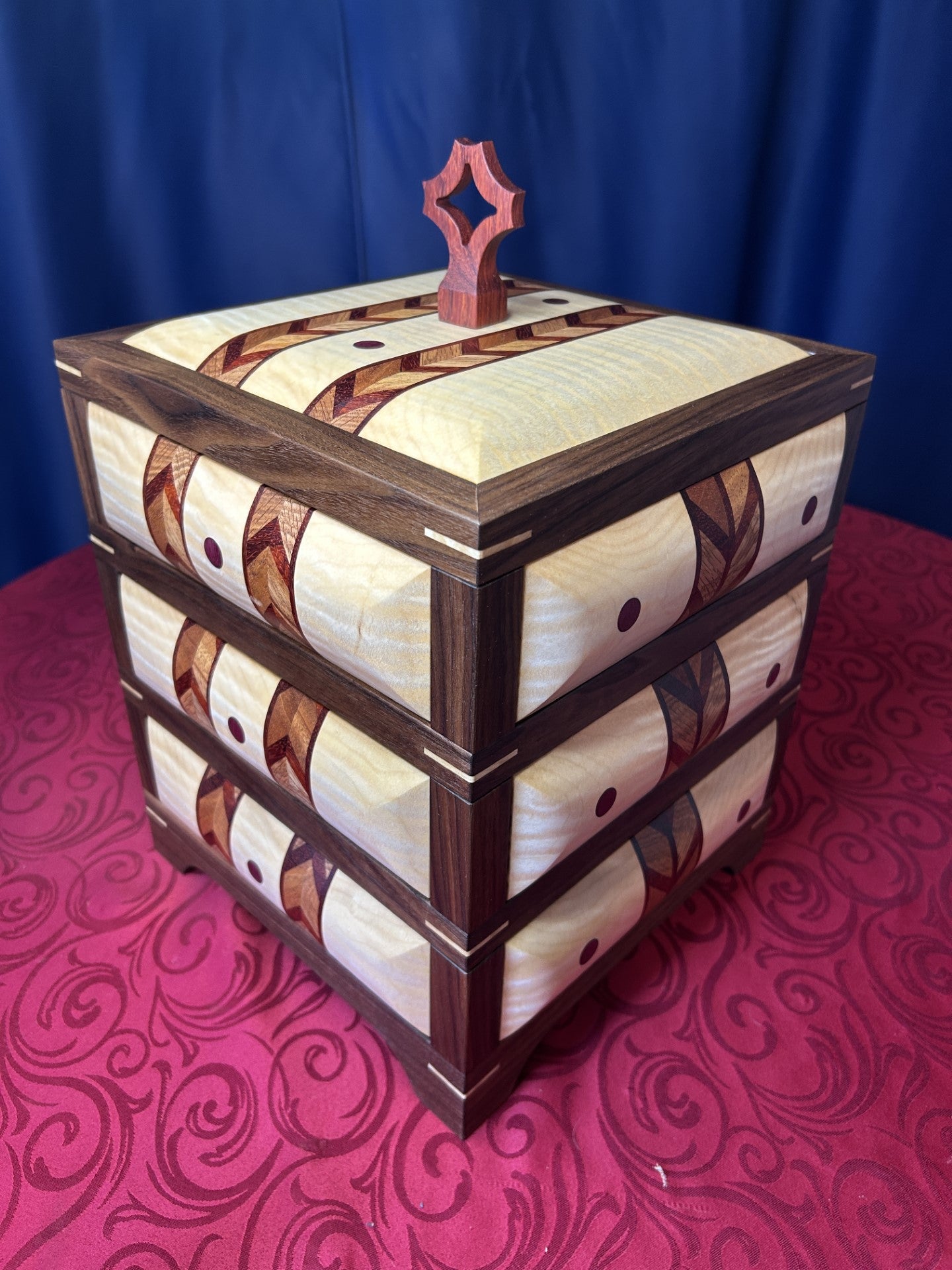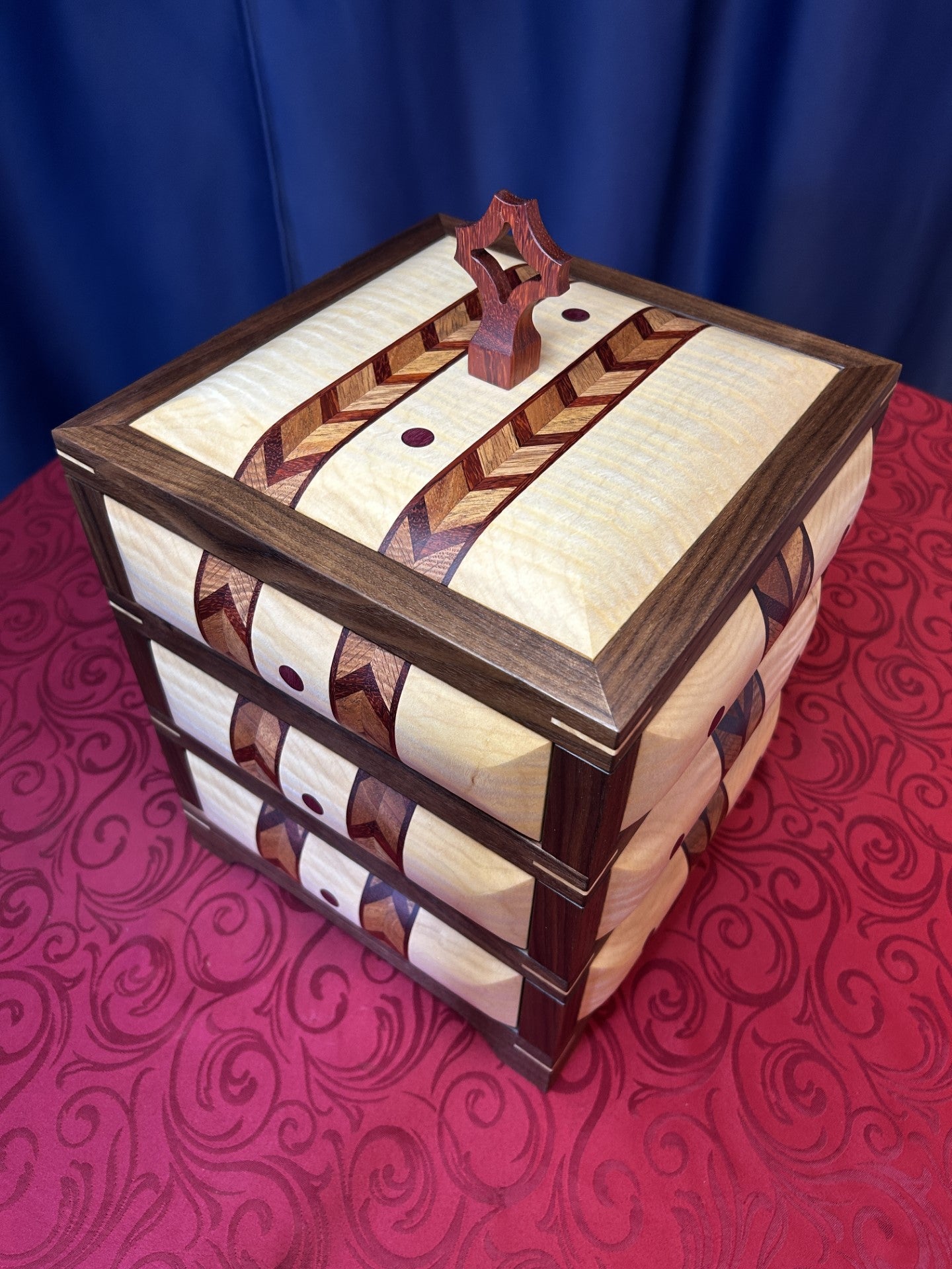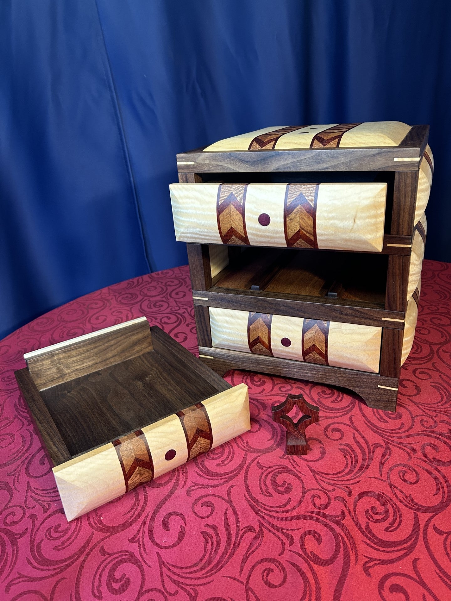 This large eye catching jewellery chest features bulging ornamented curly maple panels nestled into a dark walnut frame. The three drawers are inset into the frame to match the panels, and can be opened using a decorative magnetic pull which stores on the top panel when not in use. The drawers feature a removable maple spline and walnut runners to ensure smooth and level operation, can be removed by tipping upwards when fully open, and are securely held in place with smaller magnets. The curly maple shimmer and carefully crafted design using various woods make this an unforgettable piece of art as well as a functional chest, and it is finished with non-toxic oil varnish and beeswax.