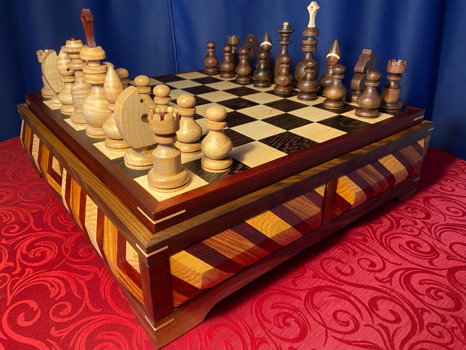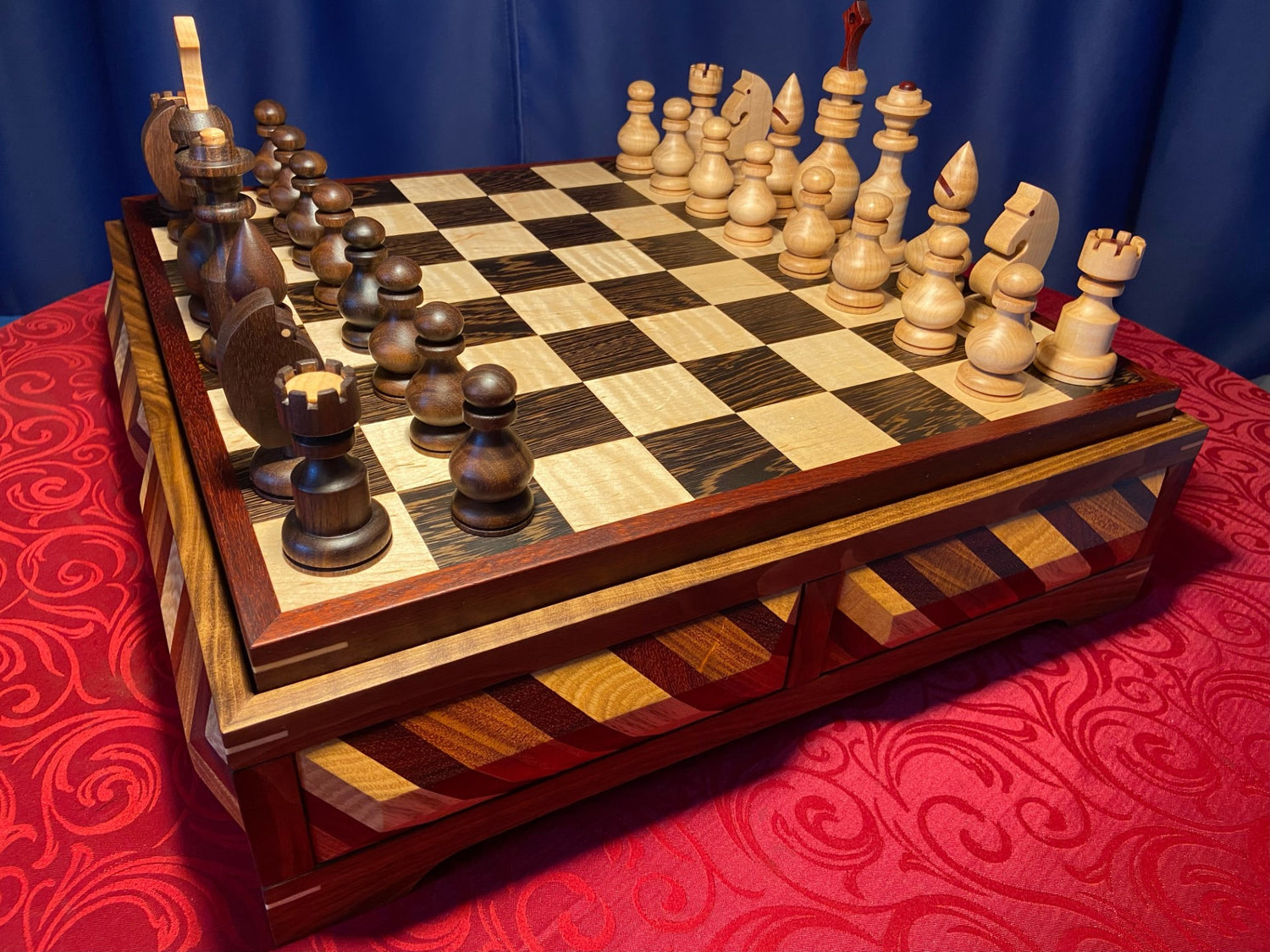 This massive chess set is a sight to behold! Utilizing natural colours, the board itself is made with laminated Wenge and Curly Maple squares (2" squares for tournament play), framed with Paduak.