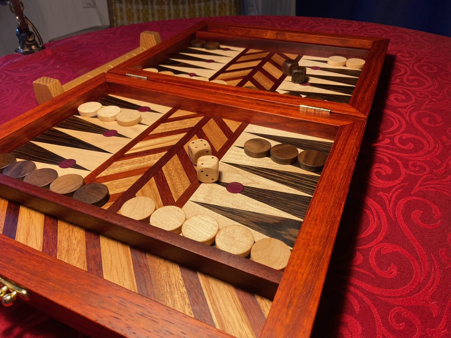 This large folding Backgammon Board is a complex custom design involving many varying types and shapes of wood for the completed set. It is all natural colours, and is constructed with through laminations to show the details of the board both when open and closed. It draws on a more classic design of board with matching triangles, but includes decorative laminations and alternating circular inlays for ease of play.