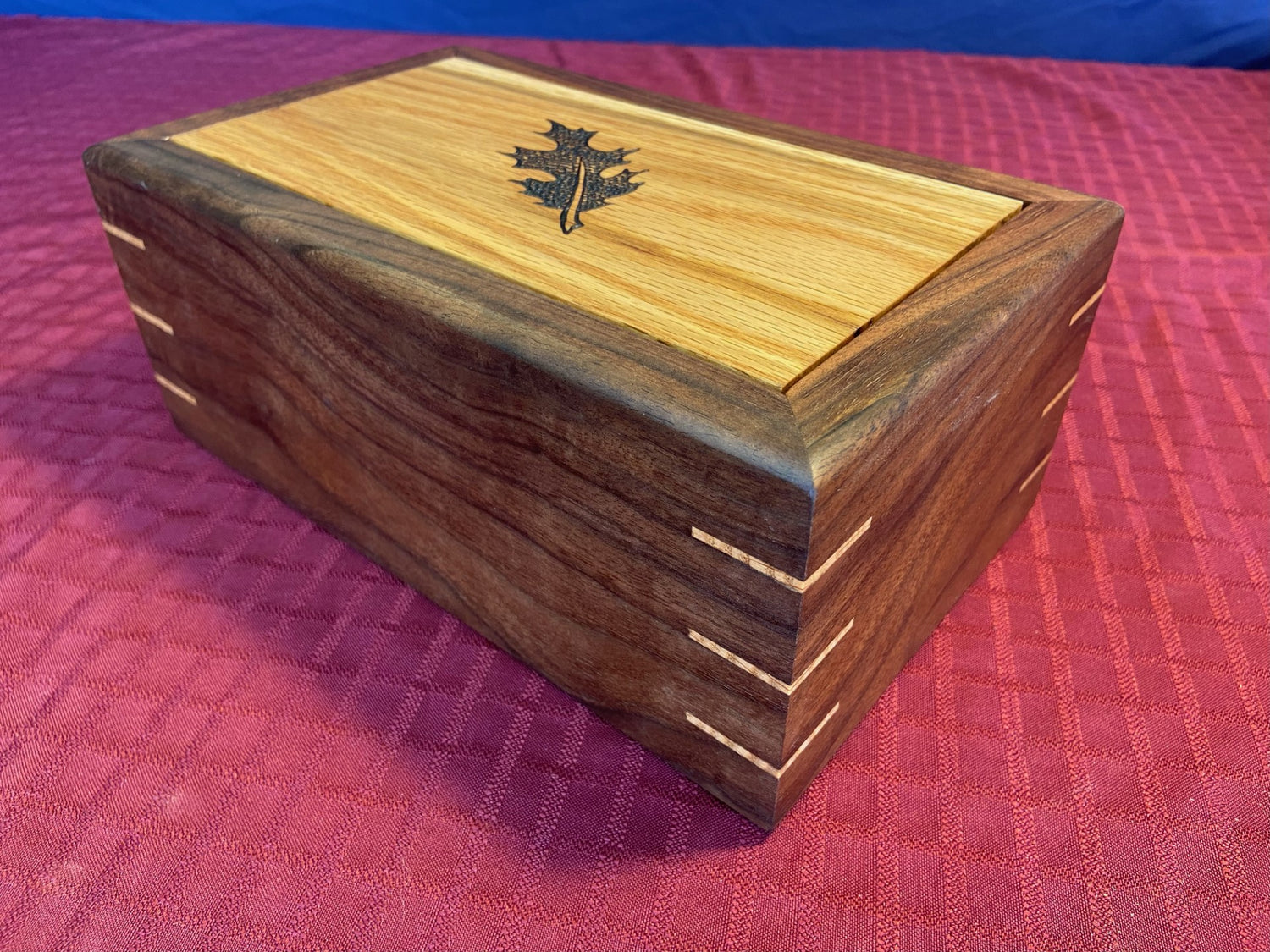 This sliding top box features all north american woods with a hand-burned oak leaf motif on the top. The neutral colours, combined with the decorative nature of the figured walnut sides, give the chest a understated and elegant appearance. It is a convenient size to store all manner of small objects, and is easily and effortlessly opened and closed.