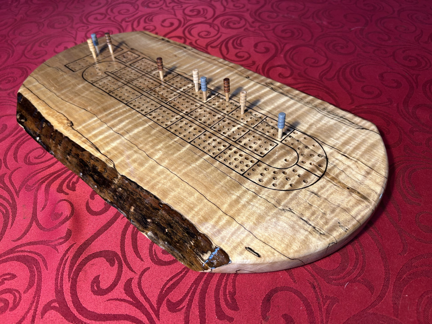 Please note: Unusual amongst our products, this cribbage is finished with an oil based varathane as it will best serve to protect the live edge. As such it should not be used for serving food.