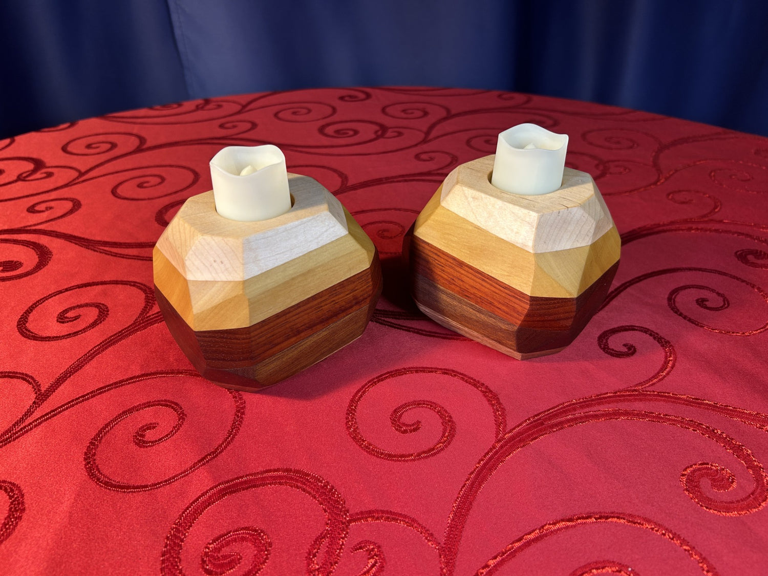 Sold individually, this delightful little light base is comprised of five differing hardwoods, angled and cut into facets to evoke a jewel like appearance. Its warm colours come from exotic woods and a natural Linseed oil and resin finish topped with beeswax