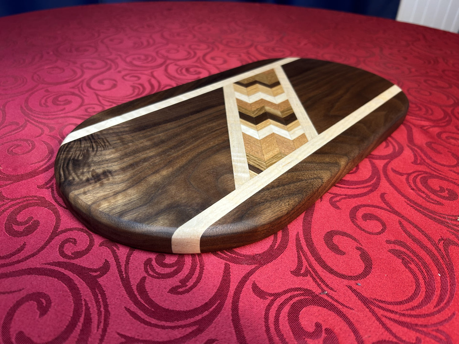This line of charcuterie boards feature various cuts of walnut, complete with a diagonal accents featuring a variety of woods. The ends are cut into a round and the edges are bullnosed for ease of use.