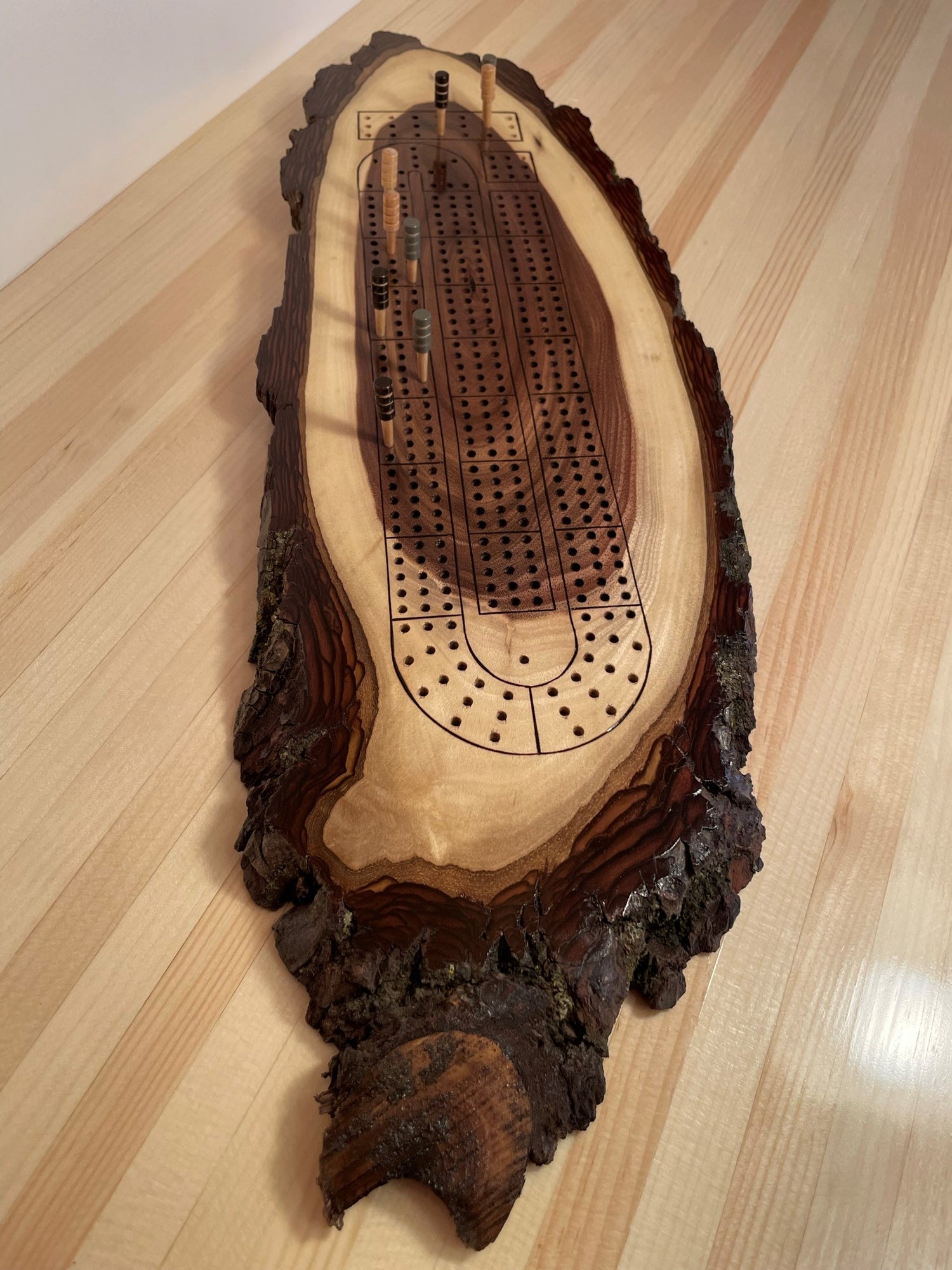 Please note: Unusual amongst our products, this cribbage is finished with an oil based varathane as it will best serve to protect the live edge. As such it should not be used for serving food.